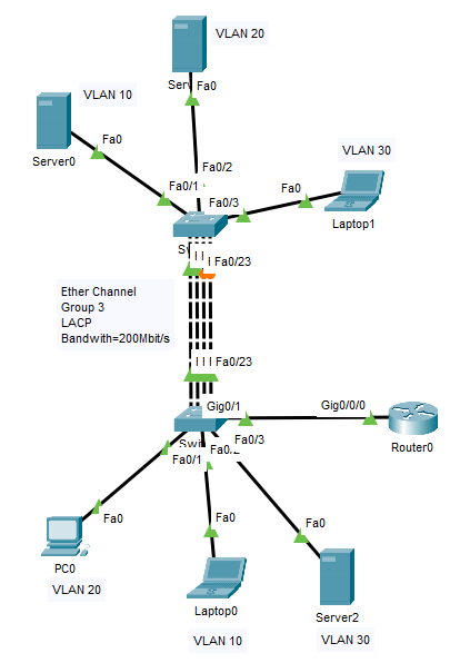 vlan 10exvlan 20exvlan 30exint fa0/2switchport mode accessspanning-tree portfastswitchport access vlan 10int fa0/1switchport mode accessspanning-tree portfastswitchport access vlan 20int fa0/3switchport mode accessspanning-tree portfastswitchport access vlan 30int g0/1switchport mode trunkEtherChannel konfigurálása