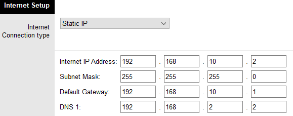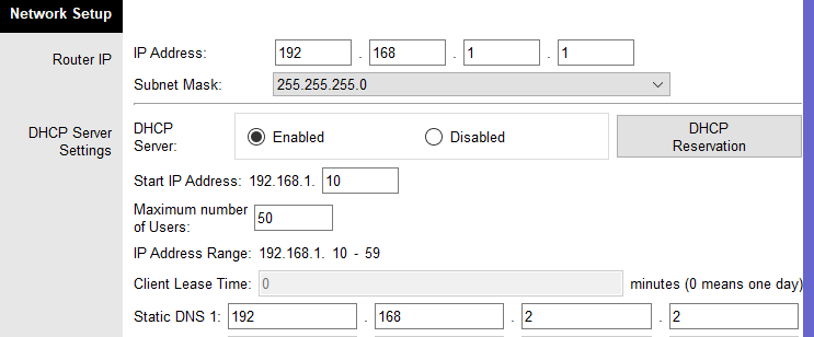 Belső hálózat beállítása az alábbiképpen néz ki. Beállíthatjuk az IP címet és az alhálózati maskot. Beállíthatjuk a kezdő IP címet és a maximális felhasználók számát is korlátozhatjuk.