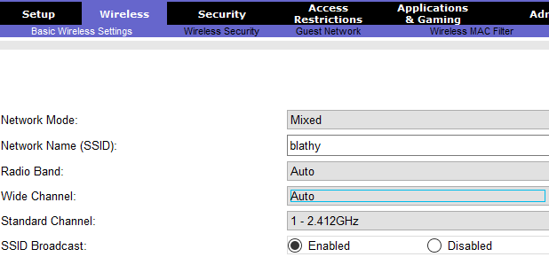 Wireless SSID beállítására van lehetőség a Wireless fül alatt.
